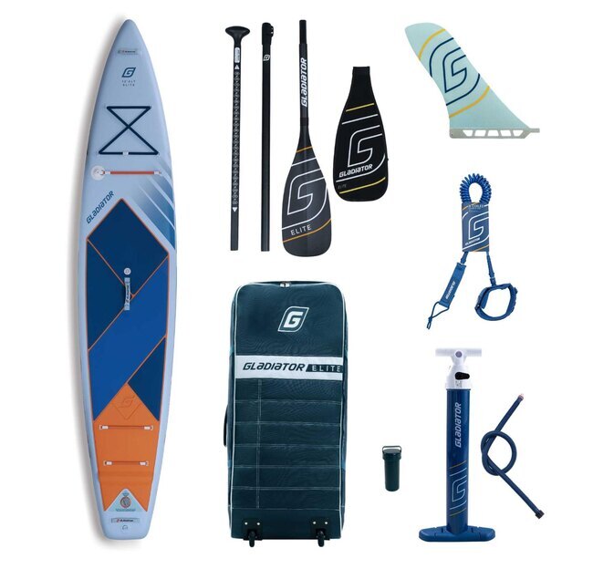 SUP Gladiator Elite 12'6LT укомплектован стильной и вместительной сумкой на колесиках, итальянским насосом двойного действия, оснащенным манометром, отличным лишем, разборным карбоновым веслом и ремкомплектом.